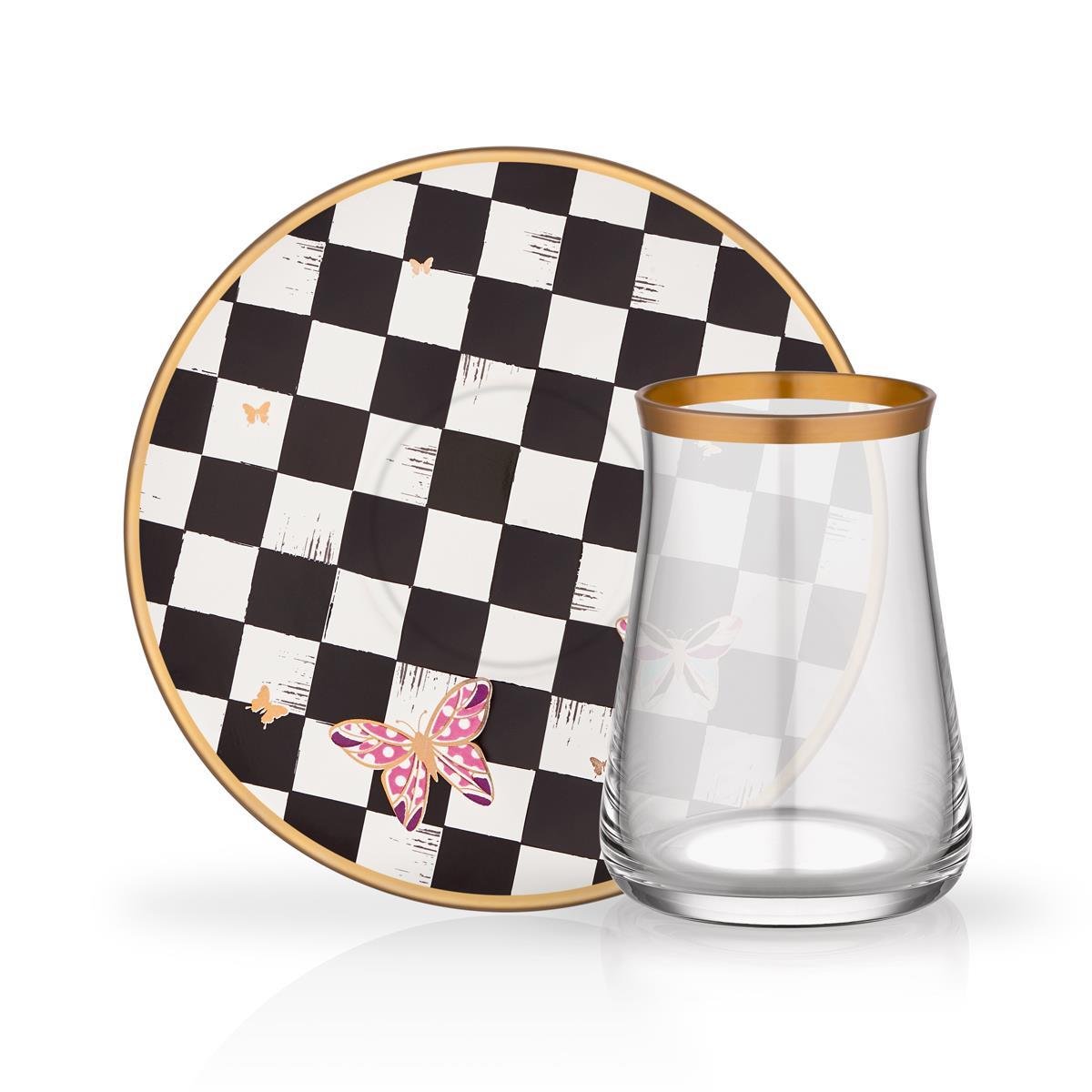 Siyah ve beyaz üzerinde kelebeği vardır.6 bardak ve 6 6 tabaktan oluşuyor.Camdır.